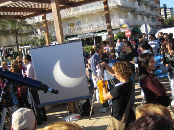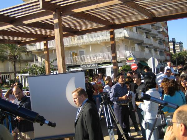 Sobre las 10h estaba todo en perfecto funcionamiento y el eclipse en marcha. La gente se iba acercando a contemplar el espectaculo tanto en el Solarescope como en la pantalla de proyección. Posteriormente pusimos filtro en el telescopio de Joan para observarlo directamente con su supervision.