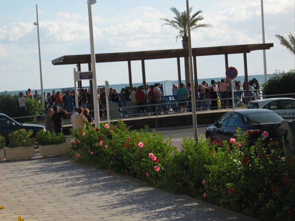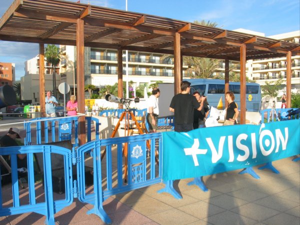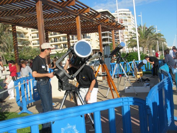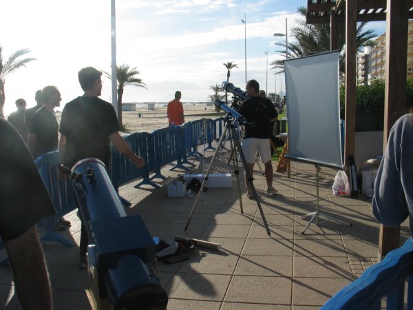 Nos levantamos temprano con la desagradable vision de un día nublado. Nos dirigimos raudos a montar todos los preparativos para la observacion popular en la playa, frente el Hotel Bayren. Teníamos las vallas de la policia para acotar una superficie donde montar los telescopios sin interferencias de la gente y sobre todo con la seguridad que no iban a mirar por el ocular. Hubiera sido imperdonable un accidente de ese tipo.