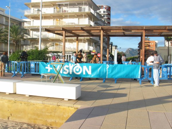 | Preparación de la vallas y colocación de la pancarta de nuestro patrocinador +Vision. Como no somo expertos en publicidad, la colocamos a nuestro entender en el mejor sitio, pero la afluencia de público hizo que a penas se viera. |