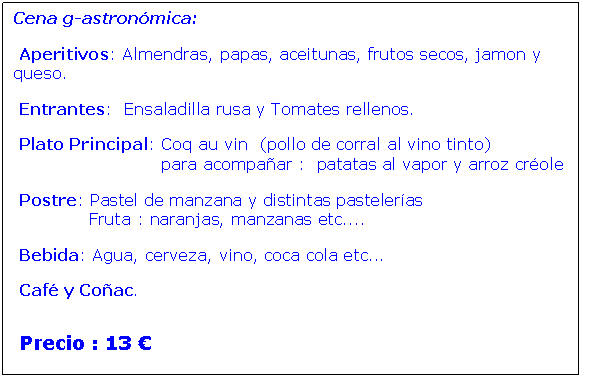 Todos los interesados en apuntarse a la comida (menú de 17 €), deben enviarme un mail para así poder organizarlo debidamente y realizar la reserva. Por favor, tened en cuenta que el restaurante tiene plazas limitadas, así que aceptaré reservas hasta completar el límite. Cualquier interesado en la comida debe decírmelo antes del 12 de diciembre. En caso de que tres días antes del 19 de diciembre las previsiones meteorológicas fueran malas, la excursión se suspendería y se aplazaría para el domingo siguiente (día 26). En todo caso, yo os avisaría con esos tres días de antelación. Si así fuera, todos aquellos que ya no pudieran acudir a esa segunda oportunidad y hubieran realizado la reserva para el 19 tendrían que avisarme, pues si no seguiríamos contando con ellos en el restaurante.