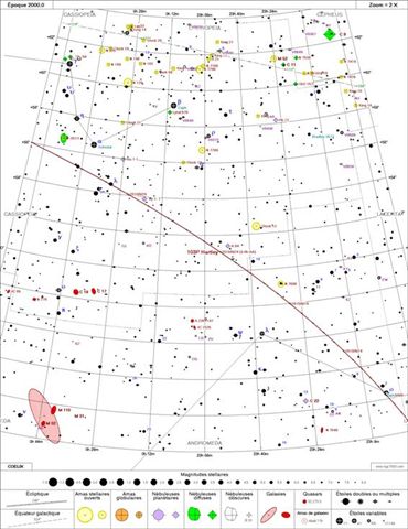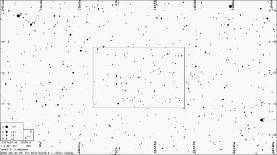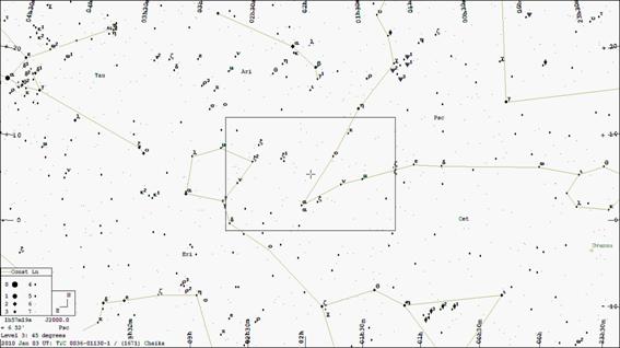 -- 3 de Enero, a las 21h 21m 45-55s TU martes: Según la página de Steve Preston podremos observar una ocultación asteroidal que sucede justo en nuestras latitudes. El asteroide 1671 Chaika de magnitud 15.5 oculta la estrella TYC 0036-01130-1 de magnitud 9.6. El asteroide está fuera de nuestro alcance y solo veremos que durante 1 segundo la magnitud de la estrella cae 5.9 magnitudes, es decir se hace invisible aun con un buen telescopio. Os pongo las cartas de situación de la estrella y sobre todo repasarla en la página del evento: