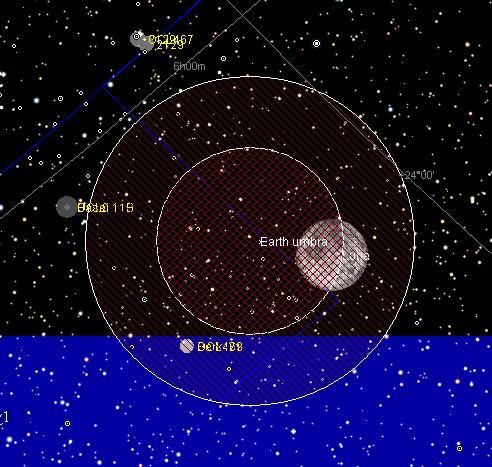 - 6h 30m. La Luna se introduce en la penumbra de la Tierra. Está a 10º sobre el horizonte. Es un fenómeno solo observable a nivel fotográfico.