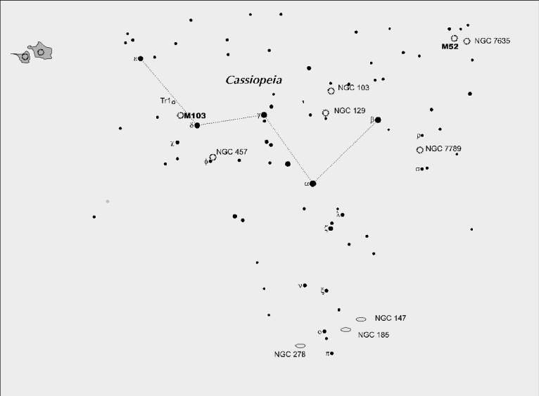 Yendo más hacia el este encontramos la blanca estrella Delta (d) Cassiopeiae de 3ª magnitud. Unos 2º al sur-suroeste de ella se encuentra NGC 457, un pequeño cúmulo abierto de los más hermosos del firmamento. Tal es su belleza que muchos se extrañan de que Messier no se percatara y lo incluyera en su catálogo, catálogo que contiene prácticamente los objetos más brillantes y hermosos del cielo (con excepciones, con es el caso de este racimo de estrellas). Su magnitud de 6,4 lo deja al límite de la observación a simple vista, de hecho hay quien dice haberlo visto (yo lo dudo). La que sí es observable con facilidad es Phi (f) Cassiopeiae, una estrella supergigante de 5º magnitud que, según algunos, pertenece al cúmulo a juzgar por el enrojecimiento de su espectro. No obstante, no todos están de acuerdo con esta opinión. Sea como sea lo cierto es que se trata de una de las estrellas más luminosa que se conocen, con una magnitud absoluta de -8,8 es 250.000 veces más brillante que el Sol.