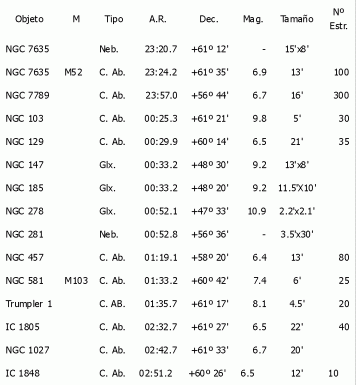 Como habéis podido apreciar, Casiopea es una constelación rica en cúmulos abiertos y pobre en otro tipo de objetos. Aunque la observación de estos cúmulos es muy gratificante porque es como ver un oasis de brillantes sobre un fondo aterciopelado, su estudio más detallado (dibujo, cálculo de magnitudes, colores, etc.) es bastante tedioso y requiere no sólo de gran dosis de paciencia sino también de un telescopio dotado de un motor de seguimiento.