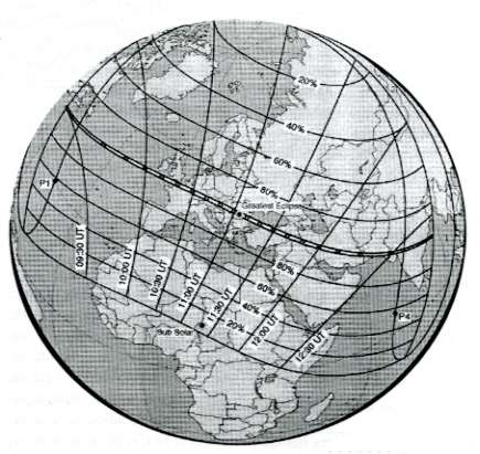 En Rumania llega el gran instante, donde el eclipse tiene su mayor duración. A las 11 horas 3 minutos y 4 segundos de Tiempo Universal (a la 1 del mediodía en nuestros relojes) en la campiña que rodea a Rimnicu-Vilcea. Aquí la totalidad será de 2 minutos y 23 segundos (6 segundos más que en Stuttgart, ¡pero vaya 6 segundos!). El Sol se encontrará a una altitud de 59° y la banda de totalidad tendrá una anchura máxima de 112 kilómetros. Cuatro minutos después el cono de sombra invade Bucarest y de ahí se dirige hacia el Mar Negro rozando Bulgaria (Varna queda justo en el límite del cono de sombra). Posteriormente entra por la parte norte de turquí y cruza el país diagonalmente en dirección sudeste. A pe sar de que An kara se sitúa a 150 km. al sur del camino de la totalidad, experimenta un profundo eclipse parcial de magnitud 0,967. Entre las ciudades turcas más grandes situadas en zona de totalidad se encuentran Sivas, Elazig y Diyarbakir. La banda de totalidad inicia su decadencia estrechándose mientras se dirige hacia Irak e Irán.