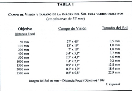 Pueden fotografiarse eclipses solares fácilmente con tal de que se siguen unas precauciones de seguridad básicas para el ojo. Puede usarse cualquier cámara réflex con dispositivo manual, sin embargo es aconsejable la utilización de teleobjetivos que permitan capturar una imagen solar lo suficientemente grande para que sea atractiva. Por regla general se utiliza objetivos de 50 mm de focal que proporcionan una imagen de 0,5 mm. Un teleobjetivo de 200 mm da una imagen mayor, 1,9 mm. Esto esta bien, pero para estos eventos lo mejor es hacerse con algún catadióptrico de 500 mm que es una opción mucho más barata que la de un teleobjetivo de la misma focal. La diferencia de precio es tremenda, aunque para ser sinceros la calidad y facilidad de uso es muy superior en el teleobjetivo. pero sigamos con el catadióptrico de 500 mm. Éste dará una imagen de 4,6 mm, nada despreciable, más si tenemos en cuenta que junto ala corona solar la imagen total será de 9,2 mm. Si aún queremos mayores aumentos a un precio asequible podemos añadir al catadióptrico una lente duplicadora 2X con lo que conseguiremos una focal efectiva de 1000 mm. Esta focal es similar a la que se consigue con pequeños telescopios de aficionados, telescopios que suelen tener focales de 1000 mm (mi Meade de 200mm S/C, tiene una focal de unos 2000 mm) y que pueden ser utilizados como teleobjetivos, eso sí, algo más incómodos pero si se tiene un telescopio ¿para que gastarse el dinero en un teleobjetivo? ¡Ojo! tengamos muy en cuenta que nunca deberemos excedernos de una focal de 2600 mm para formatos de 35 mm (hablo de la película fotográfica, claro). La mejor opción para ver todo el eclipse, incluida la corona, es un equipo con una focal no mayor de 1500 mm, preferiblemente 1000 mm. En la Tabla 1 se dan los tamaños del disco solar para focales distintas.