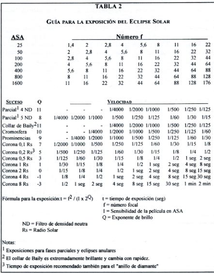 Para fotografiar toda las fases del eclipse solar con telescopio (o teleobjetivo) provisto de un filtro solar, hay que tener en cuenta el factor de reducción del filtro y la película que se va usar. El método más fácil para determinar la exposición correcta es hacer una prueba uso días antes del eclipse. Para ello usa un carrete de 50 ó 100 ASA y una abertura fija de f/8 a f/16. Para cada foto utiliza una exposición diferente empezando por 1/1000 y terminando con 1/4 segundos. Apunta todos los factores (f y velocidad) de cada foto y después de revelado comprueba cuales son las mejores. Utiliza el factor f y velocidad de la mejor fotografía que te halla salido para la fase parcial ya que el brillo de la superficie del Sol permanece constante a lo largo del eclipse, así que no es necesario ninguna compensación de la exposición salvo en las fases cercanas a la totalidad que pueden requerir dos más pasos de abertura debido al oscurecimiento solar. Ten en cuenta que estoy suponiendo que el día es perfecto, sin nubes. Si hay algo de neblina, brumas o algo que oscurezca por sí mismo el paso de la luz solar en todo su esplendor, habrá que abrir más el obturador.