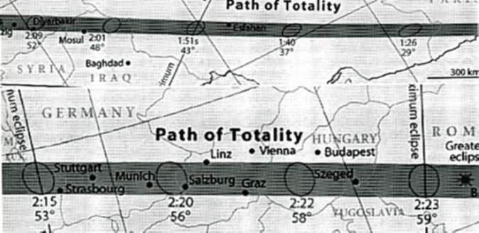 La sombra atravesará por las zonas centrales de Austria y Hungría, y sólo por muy poco dejará de lado a sus respectivas capitales, Viena y Budapest que a pesar de todo verán un eclipse con una magnitud de 0,99. Una vez sale de Hungría, la sombra barrerá brevemente el norte de Yugoslavia antes de continuar hacia Rumania. Esperemos que para esa fecha la locura de la guerra halla terminado y eslavos junto a albaneses puedan ver en paz uno de los sucesos más