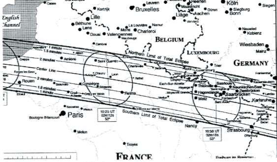 El paso de la totalidad empieza cuando la sombra de la Luna incide sobre el Océano Atlántico Norte. Inmediatamente después la sombra se moverá rápidamente hacia el Este alcanzando primero la costa Sudoeste de Inglaterra, para atravesar posteriormente el Canal de la Mancha y alcanzar la parte norte de Francia, por Normandía. Cruzará el país de NW a SE pasando a 30 km. al norte París. Los parisinos y turistas que estén en esos instantes visitando la capital de Francia verán un eclipse parcial con un elevado porcentaje (99,4%) del disco solar bloqueado por la sombra lunar. La magnitud del eclipse parcial se situará en 0,992 (La magnitud se refiere a la proporción de solapación de los diámetros solar y lunar). La sombra continuará a través de la región de Champagne para luego dirigirse hacia el sur de Bélgica, Luxemburgo y Alemania. La ciudad germana de Stuttgart se sitúa en el centro de la estrecha banda de totalidad por lo que desde allí se podrá presenciar un eclipse total con una duración de 2 minutos y 17 segundos. La gran ciudad de Munich también disfrutará de 2 minutos de totalidad siempre y cuando el cielo esté despejado, cosa que no es muy habitual incluso en pleno agosto.
