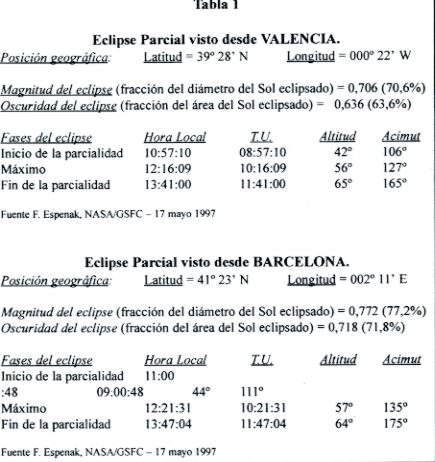 Bien, alguno de vosotros os hareis la siguiente pregunta: ¿y qué pasa con los que no podemos viajar y nos quedamos en aquí, en España? Desgraciadamente el eclipse no se verá en su totalidad desde ningún punto de la geografa de nuestro país. Sí que lo veremos de forma parcial, pero es ta parcialidad no es en absoluto espectacular. Es más, si no tienes un filtro para observar como la Luna se come parte del Sol, no te darás ni cuenta de que está sucediendo el eclipse. La disminución de luz provocada por el paso de la Luna por parte del disco solar es tan pequeña que pasa desapercibida a nuestro ojos. Eso no quiere decir que por no ser espectacular no halla que ver el famoso eclipse aunque solo parcialmente. El evento sigue siendo en cierta manera atractivo y pueden hacerse fotos bastante espectaculares con los que montar toda la secuencia del eclipse, desde el primer contacto hasta la finalización del eclipse. Cómo observarlo y cómo fotografiarlo son dos temas que expondré más adelante. Ahora explicaré como se verá la fase de parcialidad desde las ciudades de Valencia y Barcelona (latitudes media y alta de España respectivamente). Ver Tabla 1.