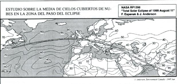 No, no soy Maldonado ni pretendo serlo. No se puede predecir con tanta antelación lo que va a pasar con la climatología, pero está claro que aunque el eclipse sucede a mediados de agosto, se puede calcular las probabilidades de que salgan nubes o salga completamente despejado. Esto es lo que ha hecho la NASA, calcular las probabilidades de observarlo según países. En el primer dibujo vemos una mapa de Europa y la zona de Asia por donde pasa el cono de sombre del eclipse, en el que se da un porcentaje que indica la media de días nublados que suele haber en esos países. Para ello se ha utilizado medidas llevadas a cabo por satélite durante ocho años (de 1983 a 1990) y posteriormente analizadas y procesadas por ordenador.
