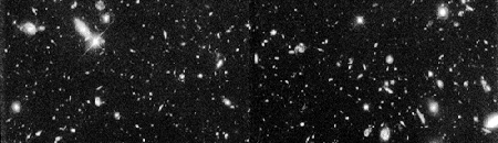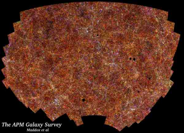 Fig. 20: APM Galaxy Survey. La imagen muestra la distribución de galaxias de un área perteneciente al cielo austral y centrada en el polo sur galáctico. Las galaxias tienen unas magnitudes aparentes de en torno a la 20ª magnitud y el área escaneada representa el mayor volumen cartografiado hasta el momento. Fotografía cortesía de Steve Maddox. |