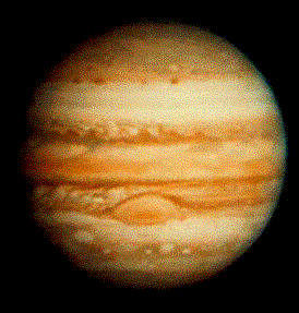 Destacan los cinturones nubosos y sobretodo la Gran Mancha Roja, un ciclón activo durante siglos. (NASA) |