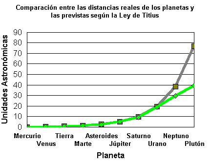 Posteriormente, en febrero de 1930, el astrónomo Cylde Tombaugh (1906-1997) observaría un débil puntito de luz y al asegurarse de su movimiento entre las estrellas, lo que delataba que estaba más cercano que ellas, calculó la distancia. Paradójicamente, no estaba a 77,2 U.A. predicha por la ley de Titius, sino tan sólo a 39,44 U.A. O sea, que aproximadamente, Plutón estaba en el lugar que le correspondía a Neptuno. En la figura 1 tenemos un gráfico con las diferencias de distancias entre las que daba la ley de Titius y las reales, de manera que podamos comparar en qué medida cuadra la verdad con lo conjeturado por ella.