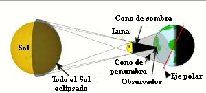 La palabra eclipse es sinónimo de desaparición (figura 1). Un cuerpo celeste cualquiera puede eclipsarse ya sea por ocultarse detrás de otro o por sumergirse en la oscuridad, haciéndose invisible. Así cuando el Sol se oculta detrás de la Luna se dice que hay eclipse de Sol, y cuando la Luna se introduce en la sombra de la Tierra, el eclipse es de Luna.