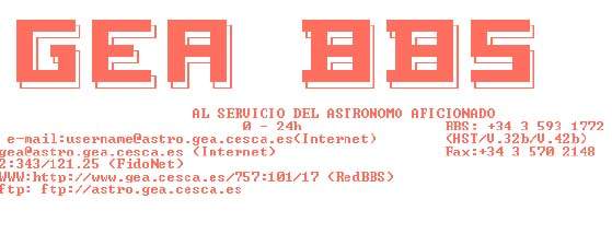 Y en primer lugar, considero de gran interés aprovechar lo que nos ofrece el GEA (Grup d'Estudis Astronòmics), ya que desde hace algún tiempo, estamos recibiendo regularmente el correo electrónico y las noticias de Internet, a través de esta estupenda BBS.