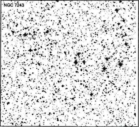 Mediante un telescopio de pequeña abertura podemos contar un elevado número de componentes. G. Lynga, estimó para NGC 7243 una población estelar de 40 componentes. Como en el caso anterior podríamos contabilizar muchas más pero, buena parte de ellas no tienen ninguna relación con el cúmulo, ya que se interponen en la línea visual entre nosostros y NGC 7243. Lo que más llama la atención es la presencia de una serie de estrellas relativamente brillantes, en formación triangular, en el centro aparente del cúmulo. La situada más al norte, con una magnitud de 8.7, es de color rojizo. El vértice occidental del triángulo lo encontramos 1.4' al SO de la primera. Esta estrella es algo más luminosa. Tomando a esta última como centro de referencia, podemos encontrar 1.3' al Este a la doble Struve 2890, muy fácil de resolver ya que la separación entre sus dos componentes no supera los 20". La estrella más brillante de NGC 7243 la encontraremos a casi 6' al oeste de nuestra "base". Su magnitud es de 8.47, lo cual nos da una idea de lo sencillo que resulta observar este cúmulo. Finalmente, cabe señalar la presencia de una posible estrella triple 9.6' al NO de nuestra estrella de referencia.