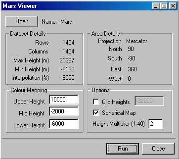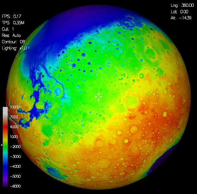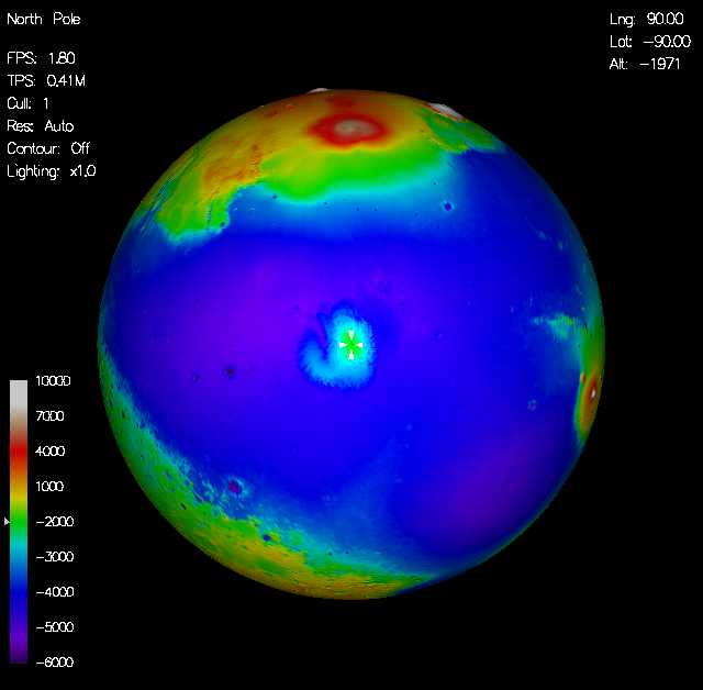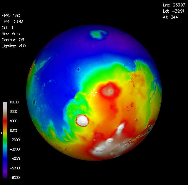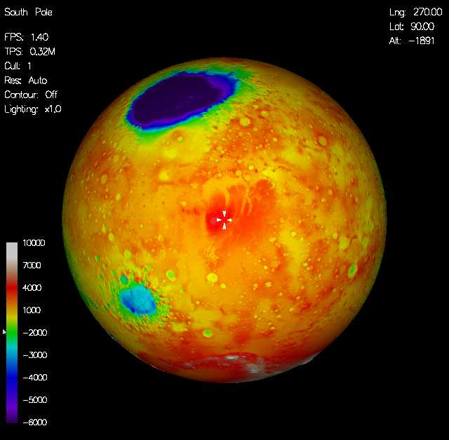 Pulsando el botón Run, comienza una renderización del planeta, que (al menos en mi caso), es desesperadamente lenta, hasta el punto de que varias veces creía que se había atascado el güindos. Una vez la imagen completada, se presenta una impresionante "fotografía" de Marte. Además, se pueden elegir hasta 12 imágenes previas (con las teclas F2 hasta F12) con algunos lugares especialmente señalados, como pueden ser el Monte Olimpo, los lugares de aterrizajes de las Viking, de la Mars Polar Lander, el Polo Norte, el Polo sur, etc...